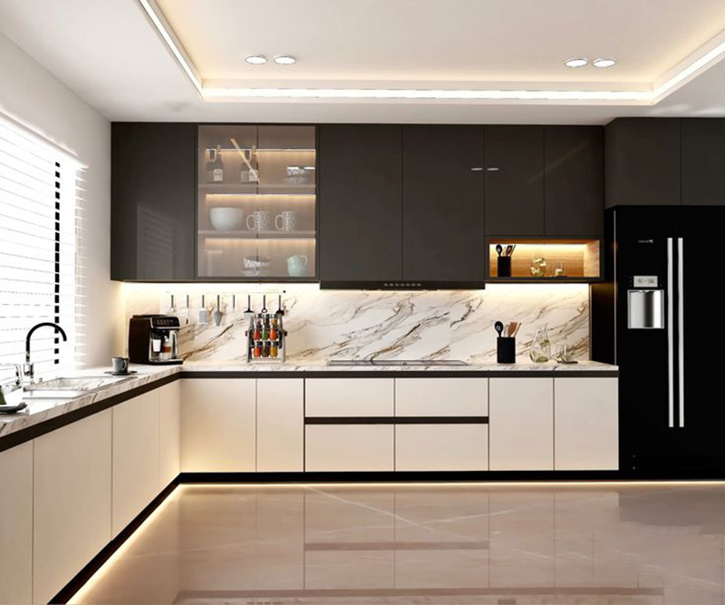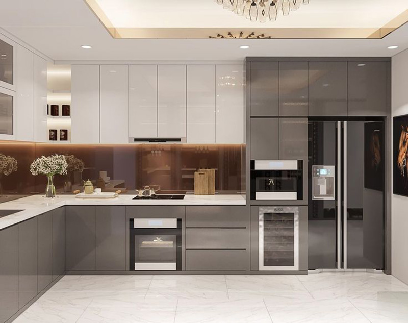 Mẫu 2: Tủ bếp chữ L inox cánh acrylic kịch trần giúp tối ưu khoang tủ, giảm bụi, hợp gia đình nhiều đồ bếp
