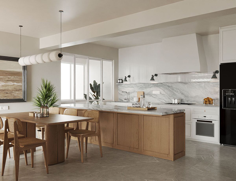 Mẫu 5: Đảo bếp vừa là điểm nhấn thẩm mỹ, tăng thêm không gian sơ chế và sinh hoạt