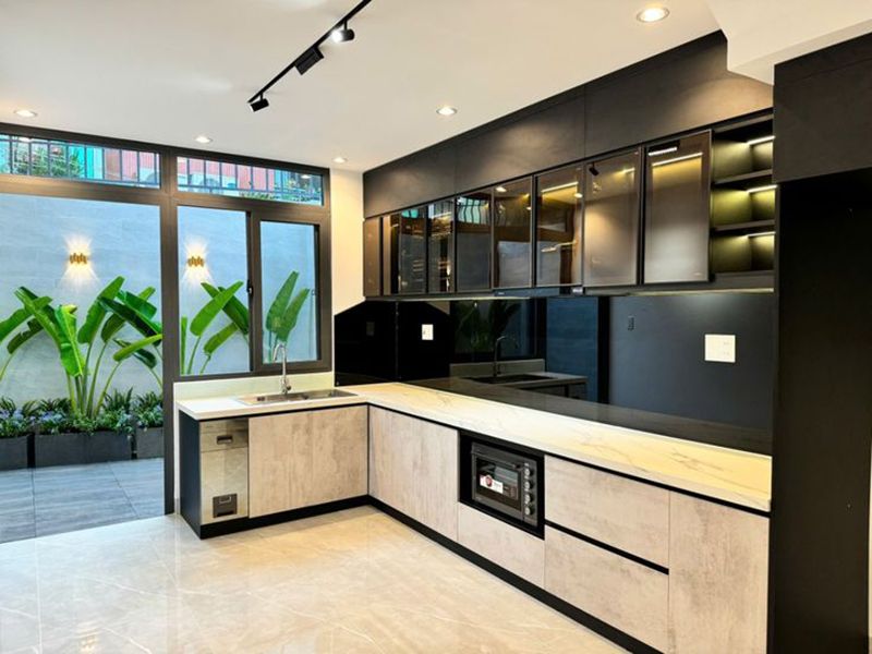 Mẫu 10: Tủ bếp khung inox cánh nhựa phong cách tối giản Nhật Bản