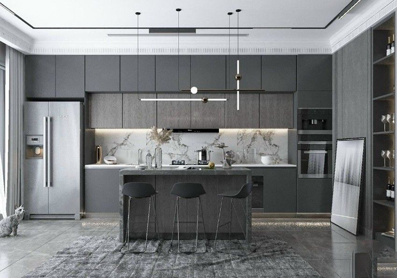 Mẫu 5: Tủ bếp inox cánh Melamine màu ghi tối giản, dễ phối nội thất