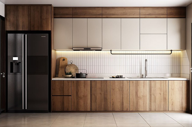 Layout chữ I khá gọn gàng, tiết kiệm diện tích. Vân gỗ sáng giúp không gian bếp nhẹ và sạch, phù hợp chung cư.