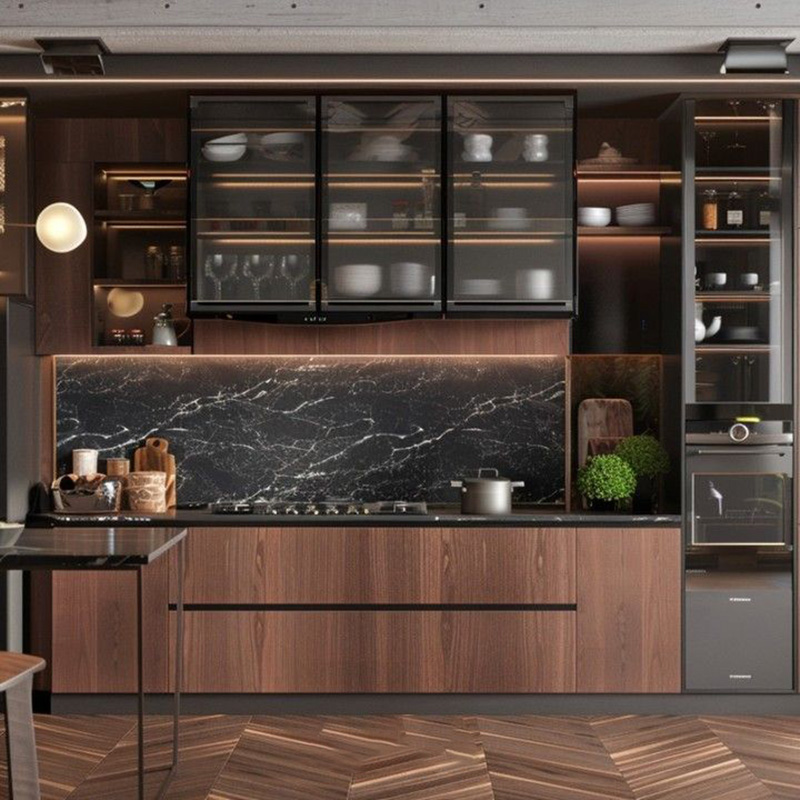 Mẫu 10: Kết hợp cùng cánh kính/tủ vitrines để bếp có thêm điểm nhấn, giảm cảm giác “đặc” của vân gỗ