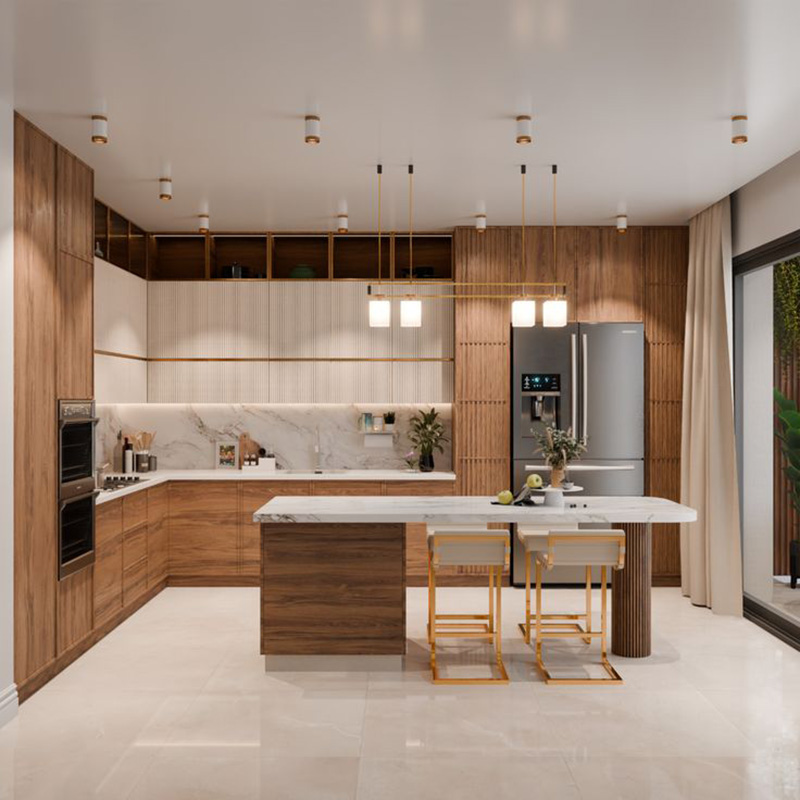Tối đa các khoang tủ và diện tích mặt bàn. Phù hợp với nhà phố, hoặc gia đình nấu nhiều. Nên ưu tiên phối đủ ánh sáng tốt để không bị bí.