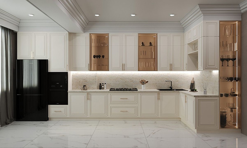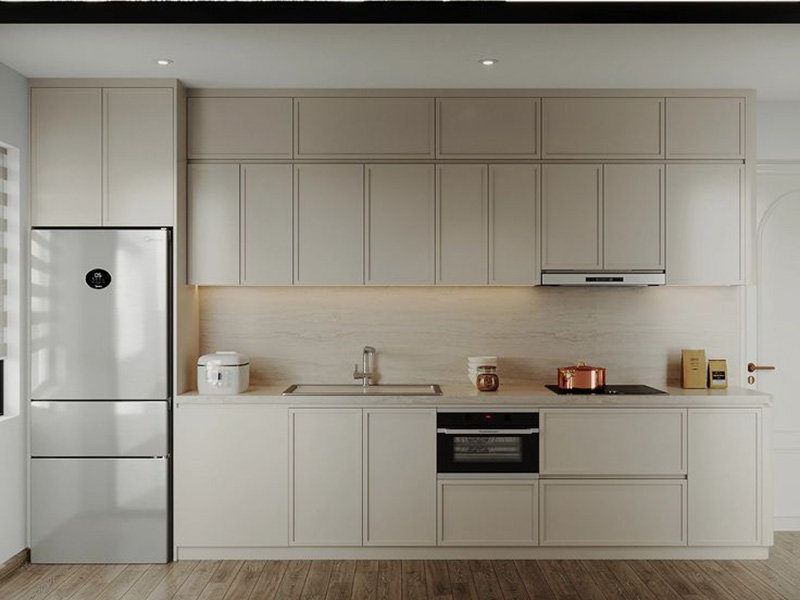 Làm kịch trần sẽ giúp tăng thêm diện tích khoang tủ và hạn chế tình trạng bám bụi. Phù hợp với gia đình có nhiều đồ bếp.