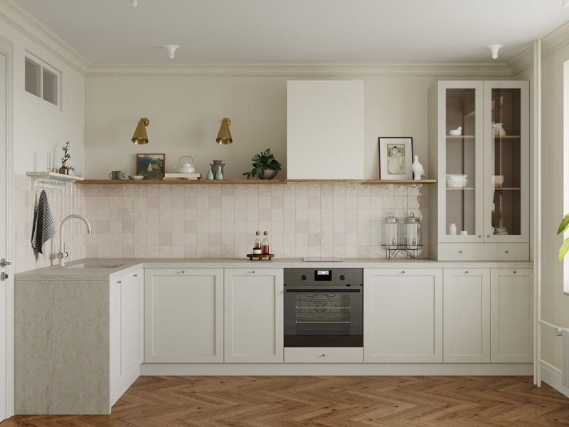 Mẫu 8: Tủ bếp trắng + vân gỗ theo phong cách Scandinavian/Japandi