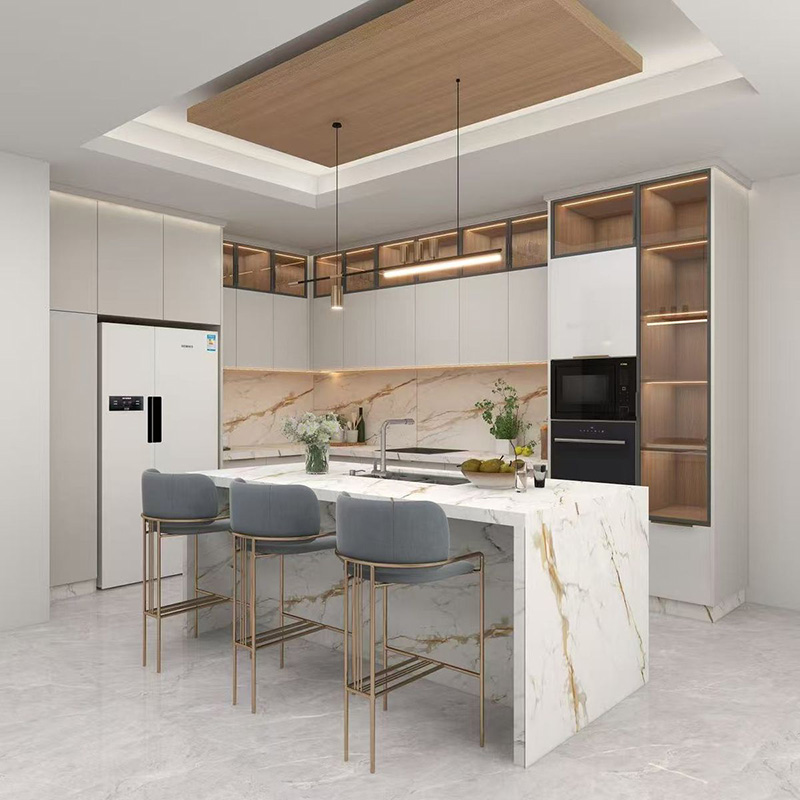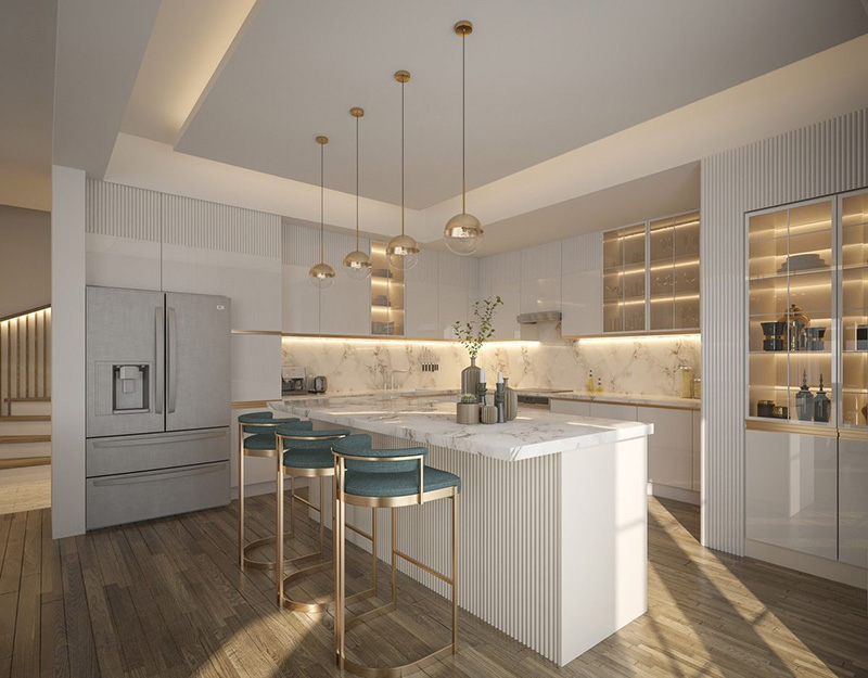 Gợi ý phối cùng mặt đá trắng vân mây, kính bếp sáng và đèn hắt