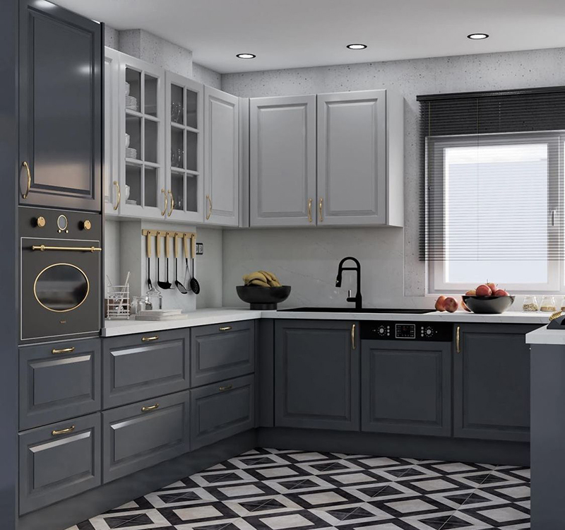 Mẫu 7: Tủ bếp chữ U màu xám sáng nổi bật