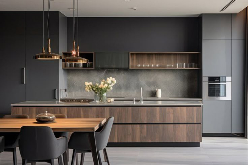 Mẫu 10: Thiết kế tủ bếp màu xám phối gỗ mang đến không gian ấm áp