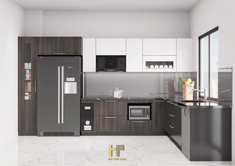 Mẫu tủ bếp Laminate TBLM43 chữ L tận dụng tối đa góc bếp giúp việc di chuyển và thao tác nấu nướng trở nên thuận tiện hơn.