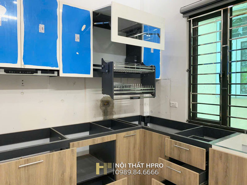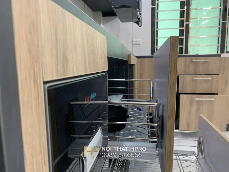 Hệ phụ kiện bếp được bố trí đầy đủ từ ray trượt, bản lề giảm chấn, giá bát nâng hạ, khoang để đồ khô đến khu vực bố trí thiết bị âm tủ như lò nướng, lò vi sóng, máy rửa bát…