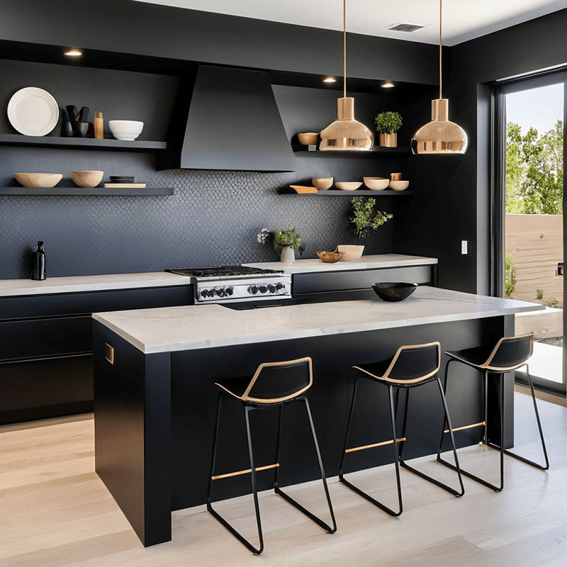 Nếu các bạn thích sang nhưng không quá mức hiện đại, thì tân cổ điển màu đen sẽ mang lại cảm giác “quyền lực” và đắt giá, nhất là khi phối cùng với mặt đá vân.
