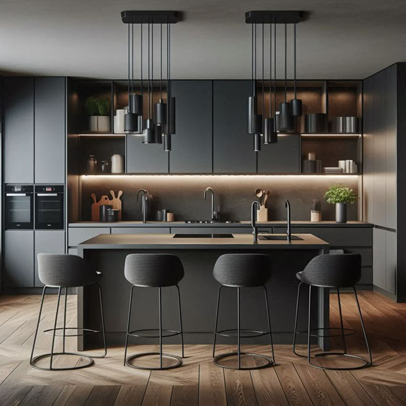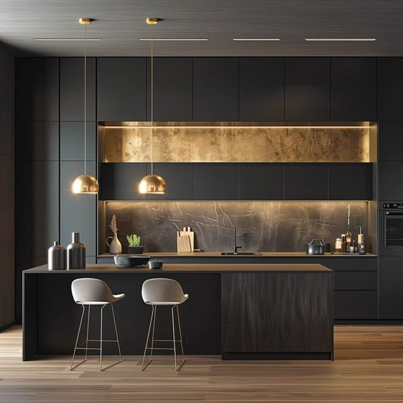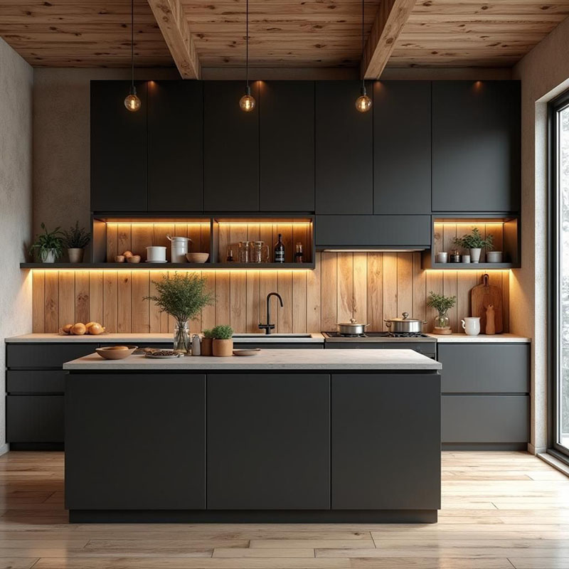 Đen nhám là một trong những lựa chọn đang lên mạnh vì mang cảm giác sang trầm, thiết kế hiện đại và “đỡ lộ bẩn” hơn các bề mặt bóng. Nhìn tổng thể thì đen matt tạo hiệu ứng mịn, phẳng, khá dễ kết hợp ánh sáng vàng ấm để căn bếp vừa sang vừa ấm.