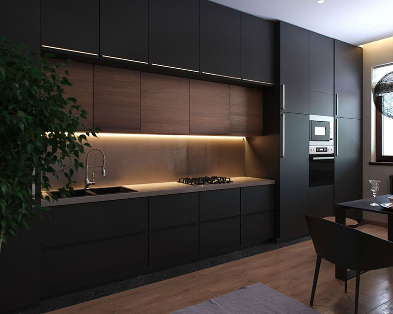 Với bếp có diện tích dài hẹp, layout chữ I là lựa chọn tối ưu về không gian và chi phí. Màu đen giúp căn bếp nhìn gọn, sạch sẽ, có chiều sâu nhưng vẫn có thể cân bằng sáng.