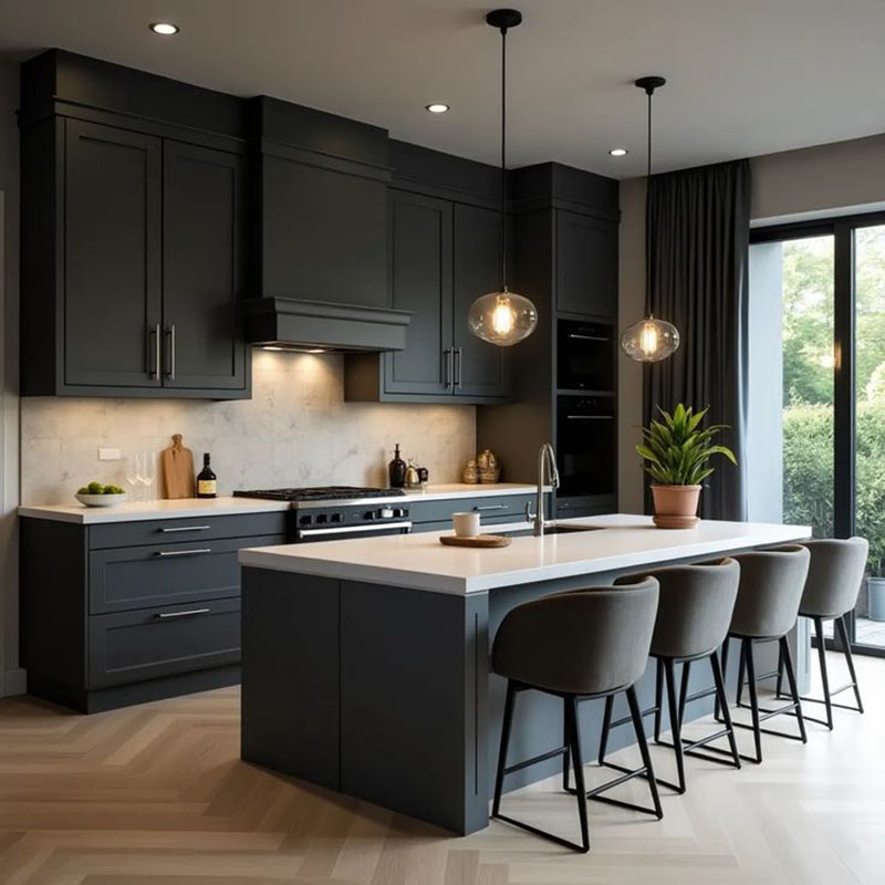 - Tủ bếp màu đen có đảo bếp / quầy bar