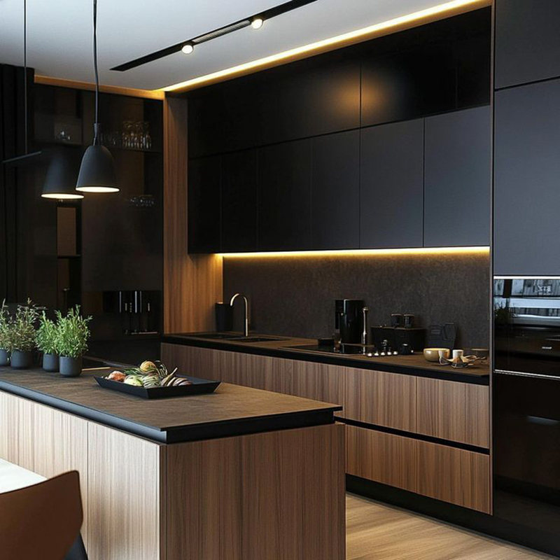 Trong không gian bếp thì sự tương phản của hai màu này tạo hiệu ứng thị giác rất mạnh: vừa hiện đại, vừa sang, dễ dàng tạo điểm nhấn mà không cần quá nhiều các chi tiết.