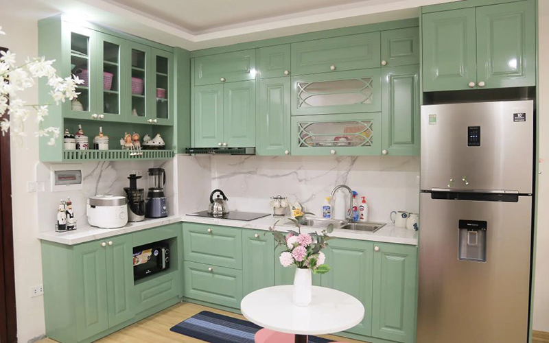Nếu các bạn ưu tiên về độ bền, khả năng vệ sinh và mong muốn bếp “sạch – hiện đại”, nhóm cánh kính sẽ là một lựa chọn đáng cân nhắc. Xanh mint khi lên khung kính thường mang lại cảm giác trong – sáng – hiện đại, hợp với nhà phong cách tối giản.