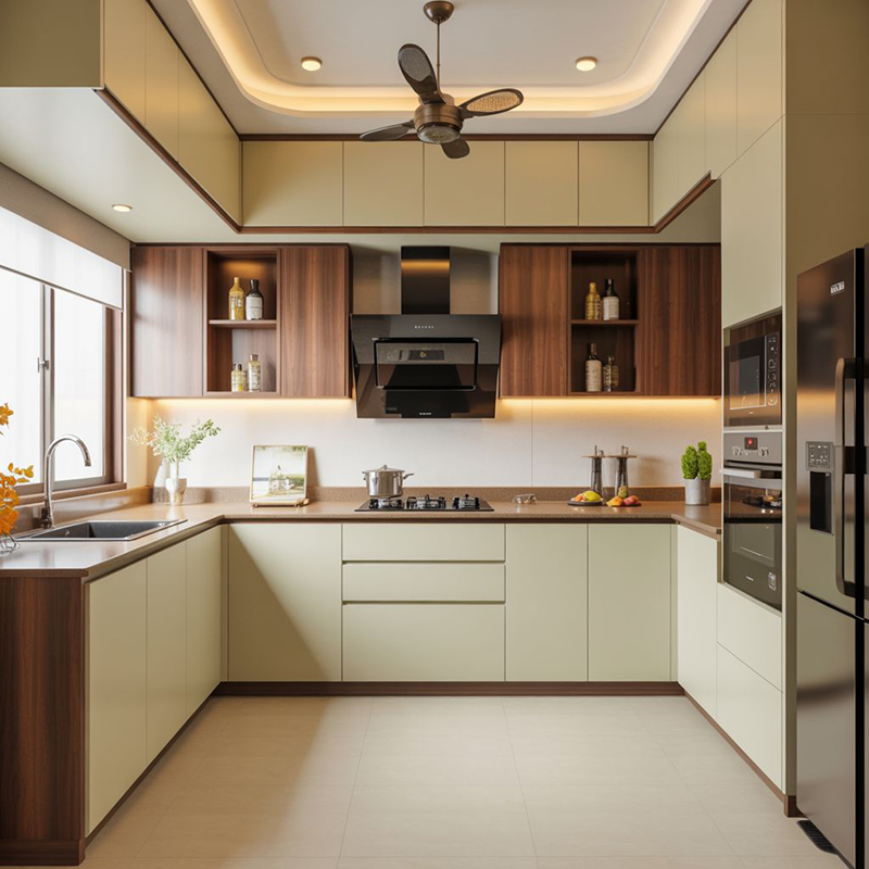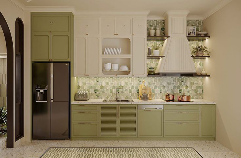 Gợi ý từ HPRO với không bếp nhỏ và muốn không gian sáng hơn, bạn có thể chọn xanh mint cho phần tủ dưới, còn tủ trên thì sử dụng màu trắng/kem để bếp thoáng.
