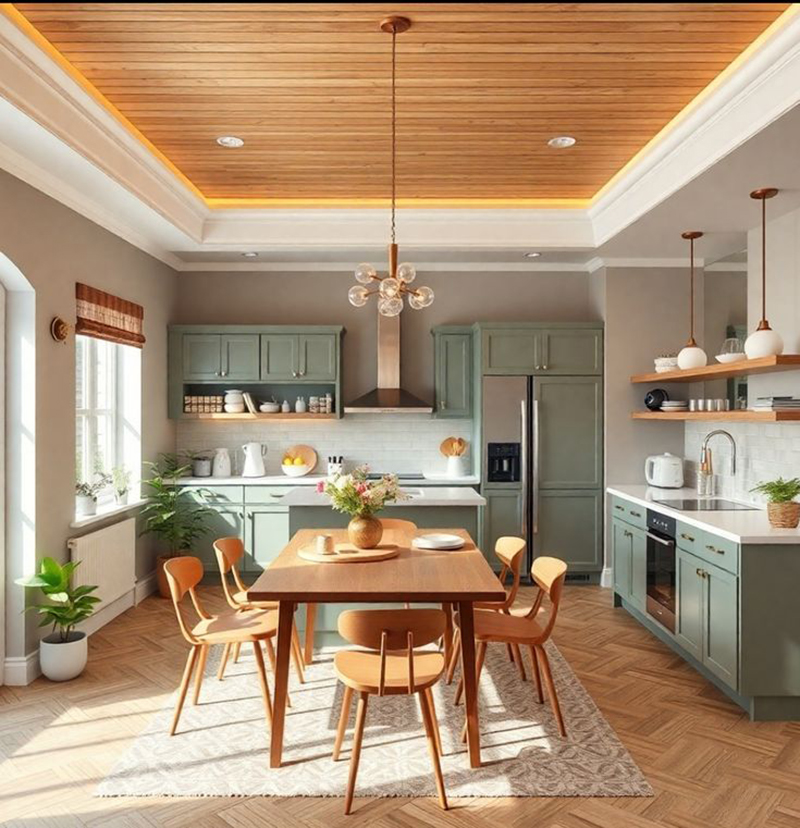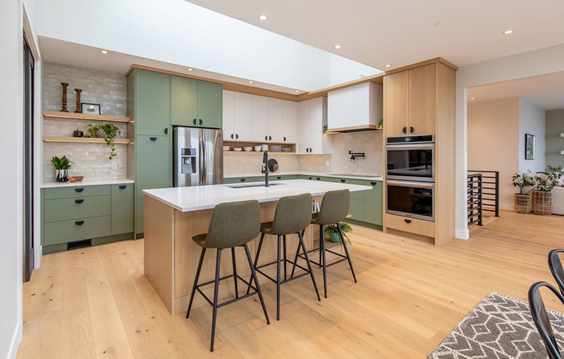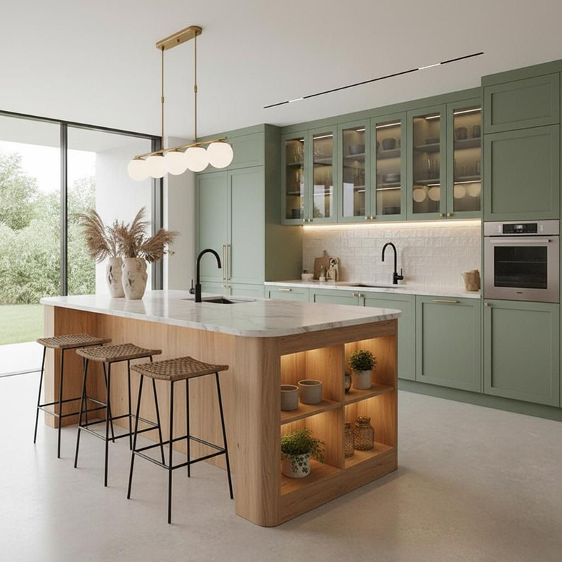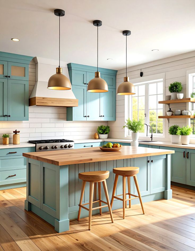 Xanh mint + đảo bếp ốp gỗ (cân bằng ấm – mát)