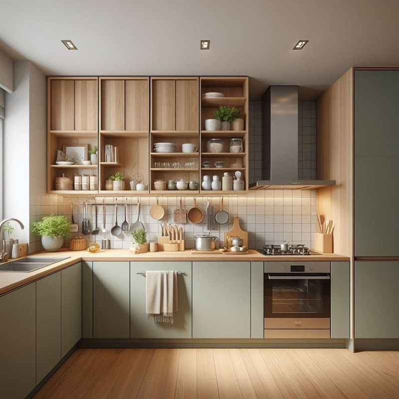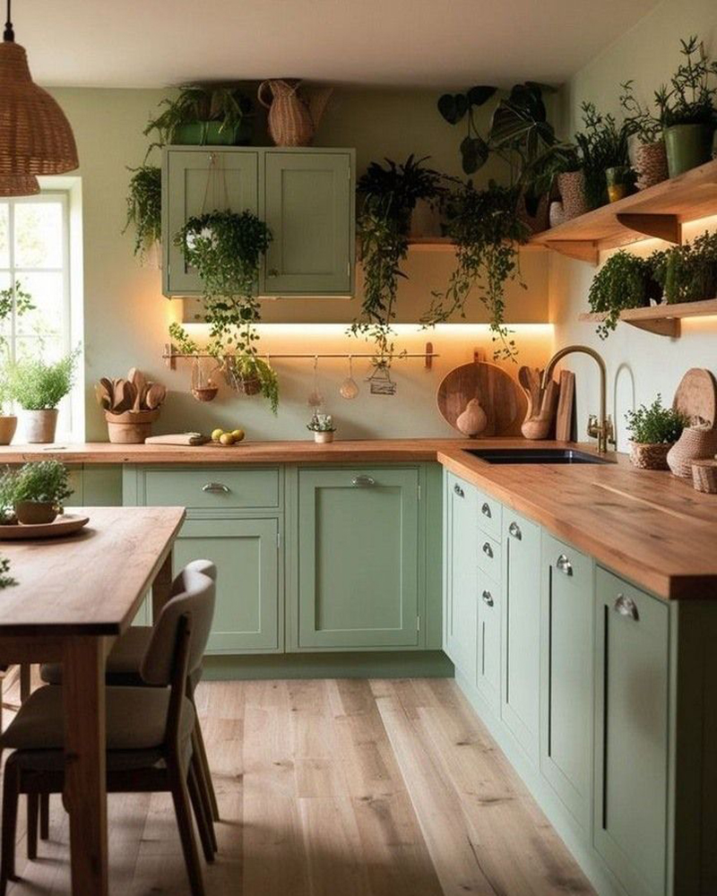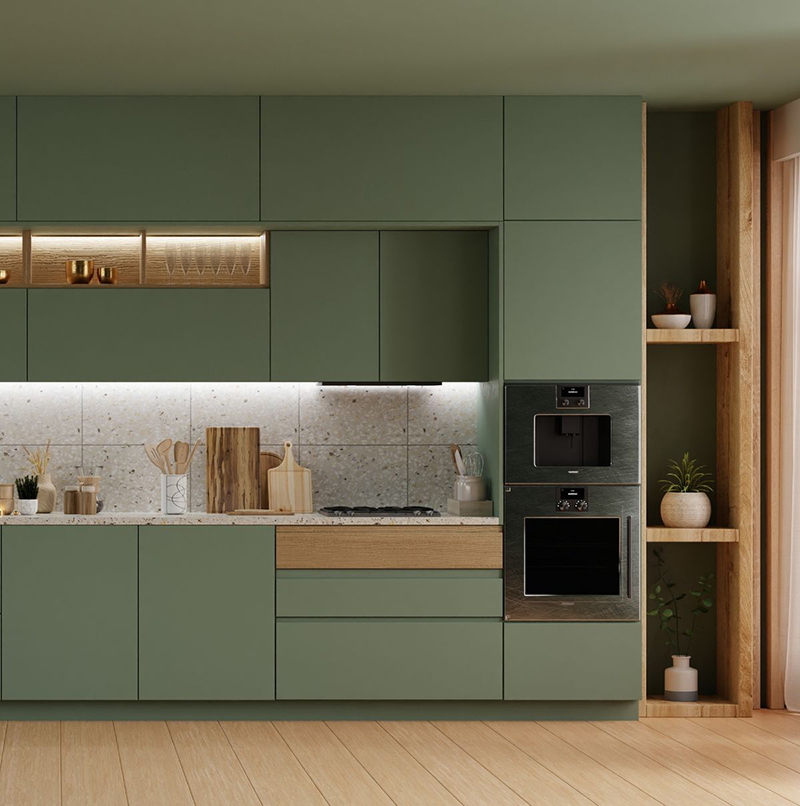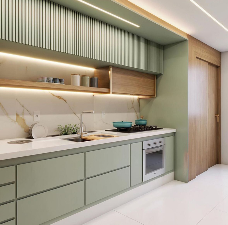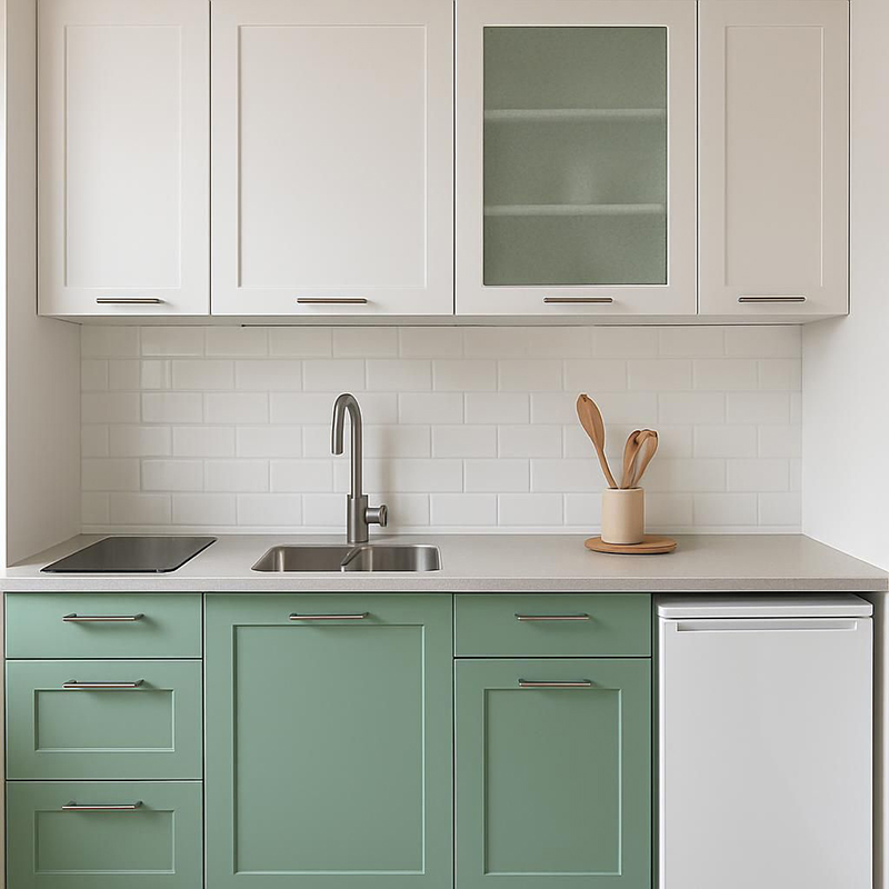 Với căn bếp nhỏ, mục tiêu là gọn – sáng – thoáng. Xanh mint sẽ làm tốt nhiệm vụ “làm dịu mắt” và tăng cảm giác sạch sẽ.