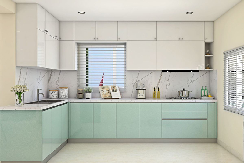 Xanh mint Acrylic bóng kết hợp mặt đá trắng vân