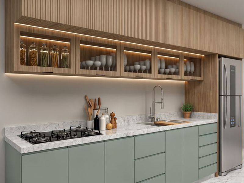 Xanh mint + đèn LED hắt tủ (tăng cảm giác sạch)