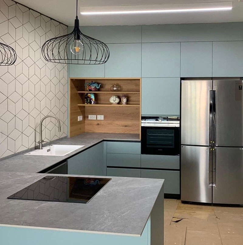 Nhà rộng thì có thể “chơi” xanh mint theo kiểu đồng bộ hoặc phối kết hợp màu để tạo cảm giác cao cấp hơn. Thêm đảo/quầy bar sẽ giúp cho bếp vừa đẹp, vừa tiện cho sinh hoạt gia đình.