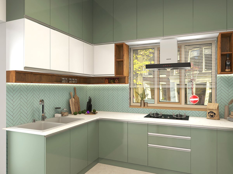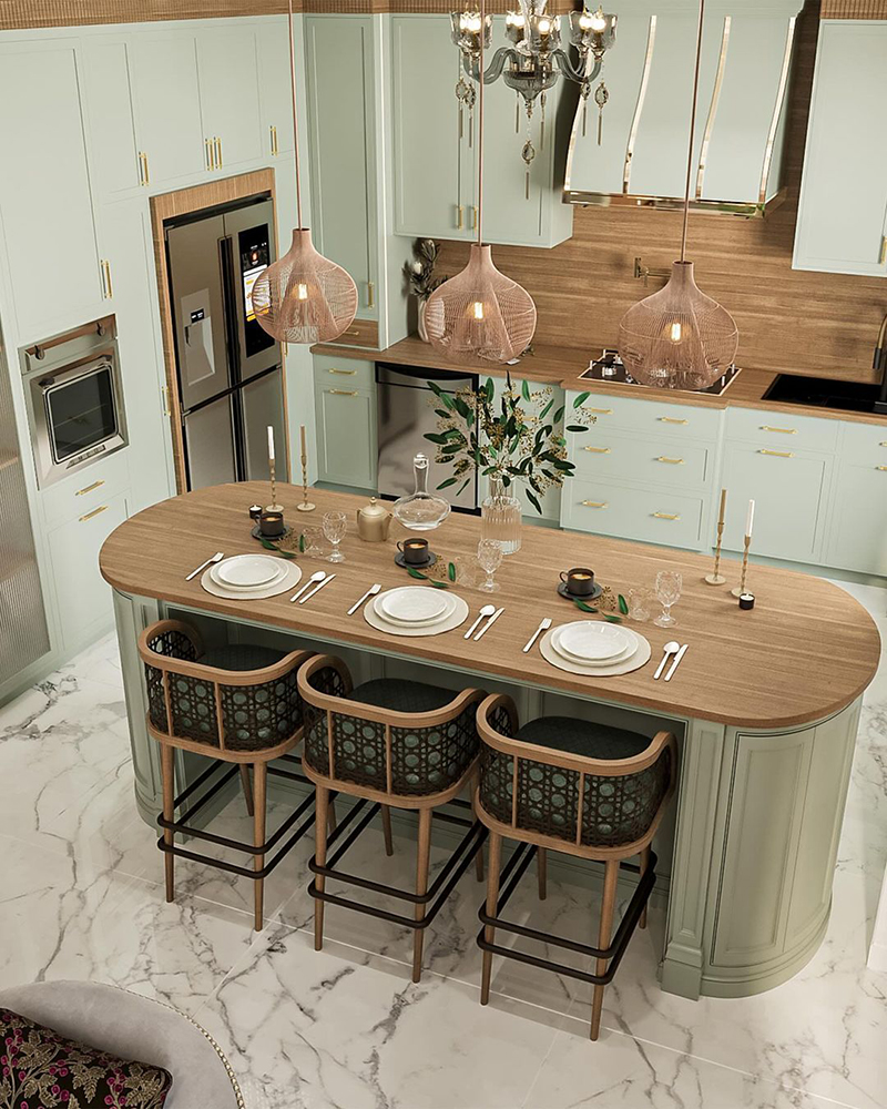 Bếp chữ L là một lựa chọn phổ biến vì nó có thể tối ưu góc và tạo luồng thao tác hợp lý. Khi kết hợp cùng đảo bếp/quầy bar, xanh ngọc càng tôn “lên chất” vì có mảng lớn diện tích để tạo điểm nhấn.