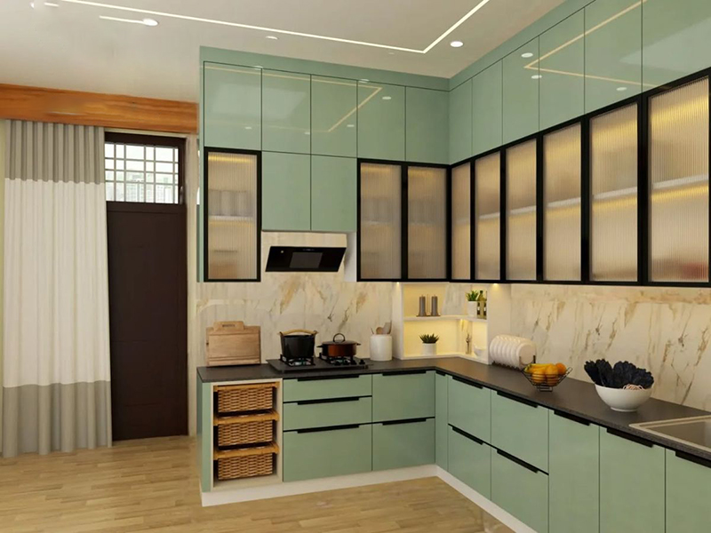 Mẫu 4: Tủ bếp xanh ngọc kết hợp phụ kiện đen mờ (tối giản hiện đại)