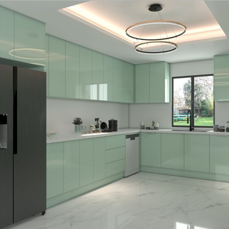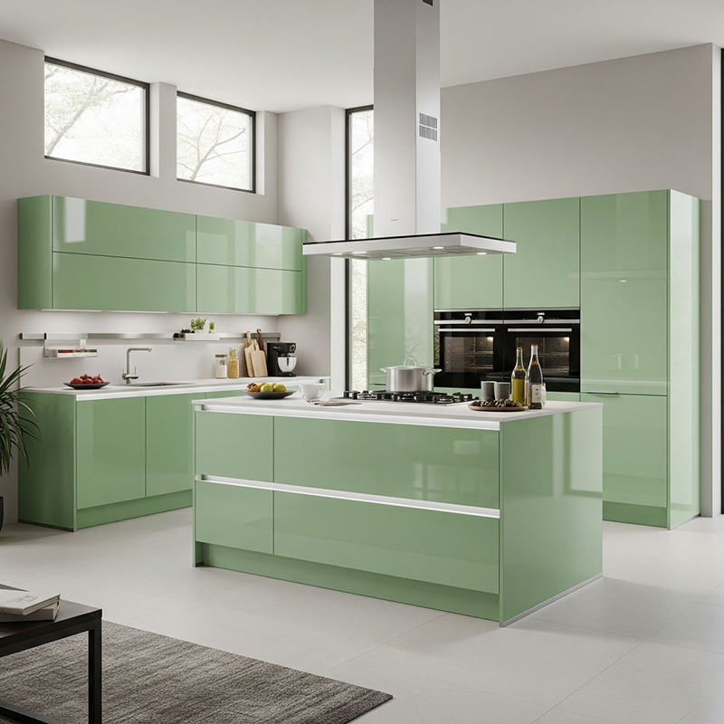 Xanh ngọc là gam màu xanh pha giữa xanh lá và xanh lam, thường có thêm sắc trắng để tạo được độ “trong” và dịu. Trong thiết kế bếp, xanh ngọc thường được sử dụng theo 3 hướng: làm màu chủ đạo cho phần cánh tủ, làm điểm nhấn cho khu vực tủ dưới/đảo bếp, hoặc phối cùng với trắng – gỗ để tạo tổng thể hiện đại.