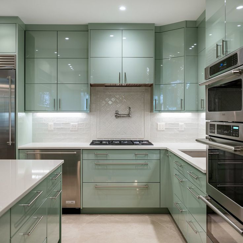 Mẫu 9: Xanh ngọc + kính bếp trung tính + đảo bếp trắng (cân bằng màu)
