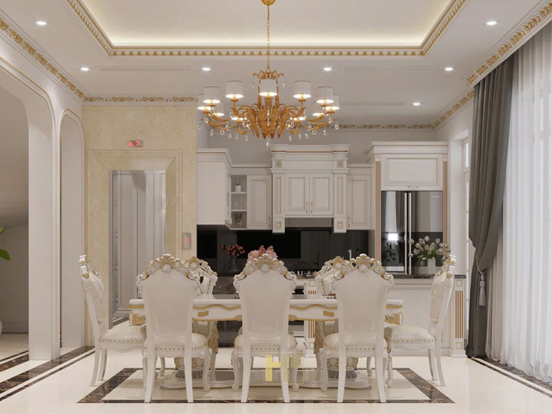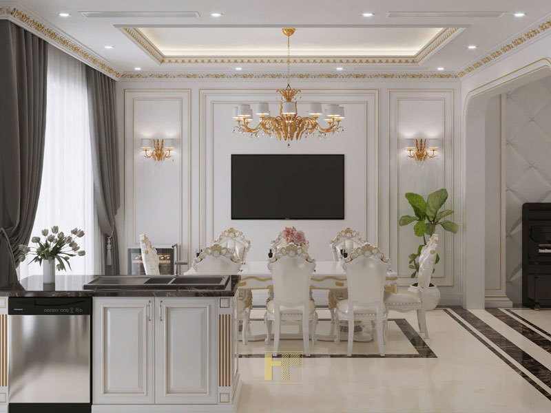 Thiết kế tủ bếp phong cách Tân cổ điển, nổi bật với thiết kế tinh xảo và sự kết hợp hài hòa giữa vẻ đẹp sang trọng và tính tiện nghi hiện đại. Toàn bộ hệ tủ được sơn trắng điểm chỉ vàng ánh kim, tạo cảm giác thanh lịch, quý phái và phù hợp với không gian bếp cao cấp.