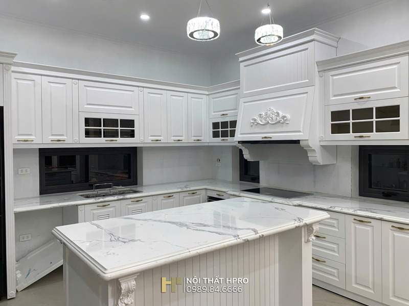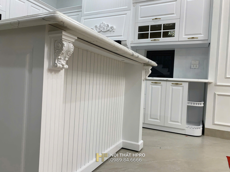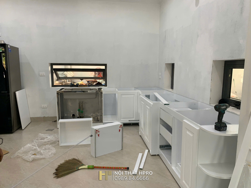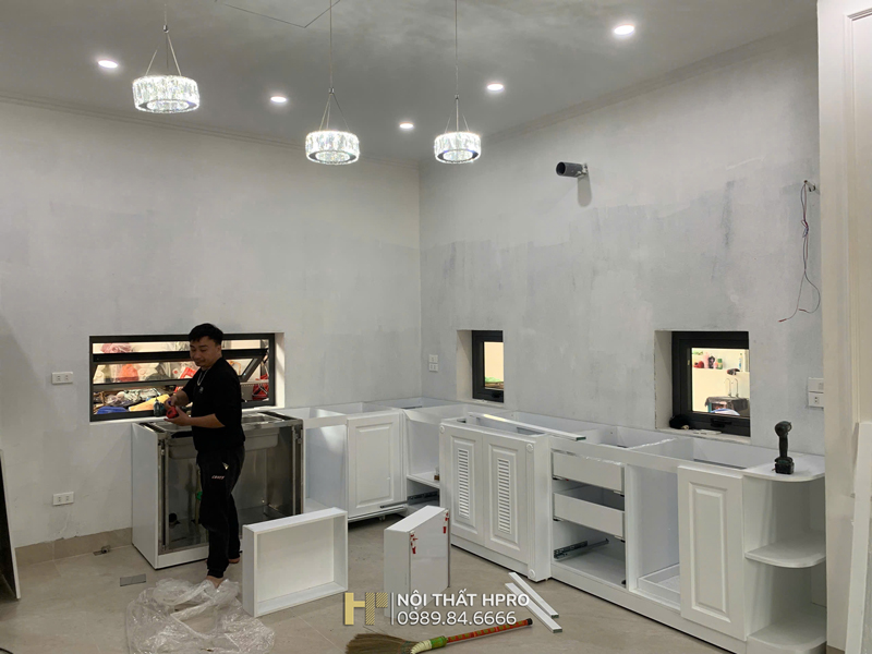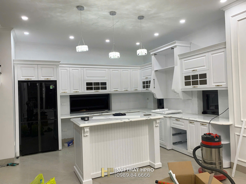 Hình ảnh thi công thực tế tủ bếp tân cổ điển tại nhà chị Thuỷ