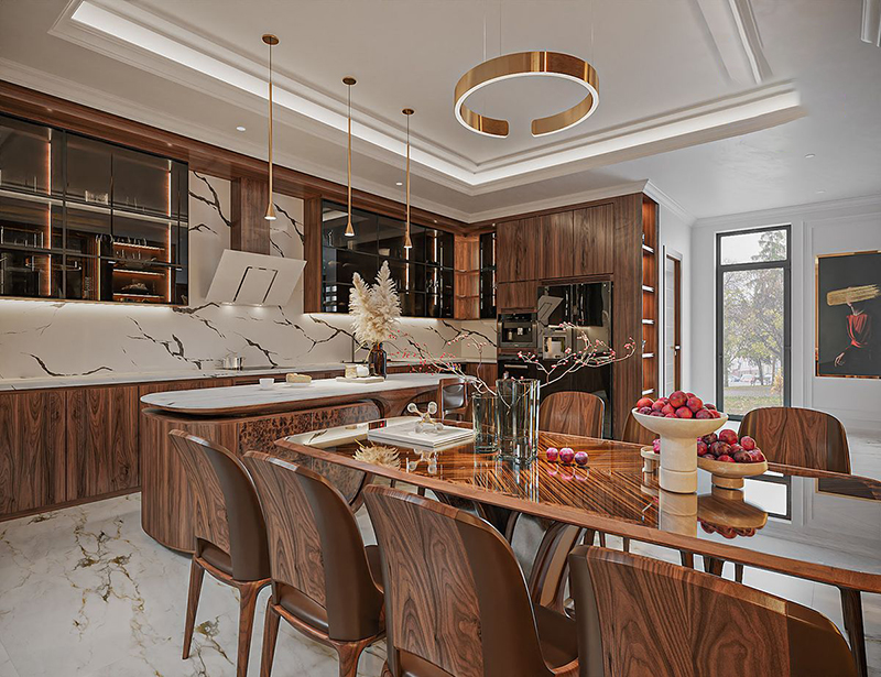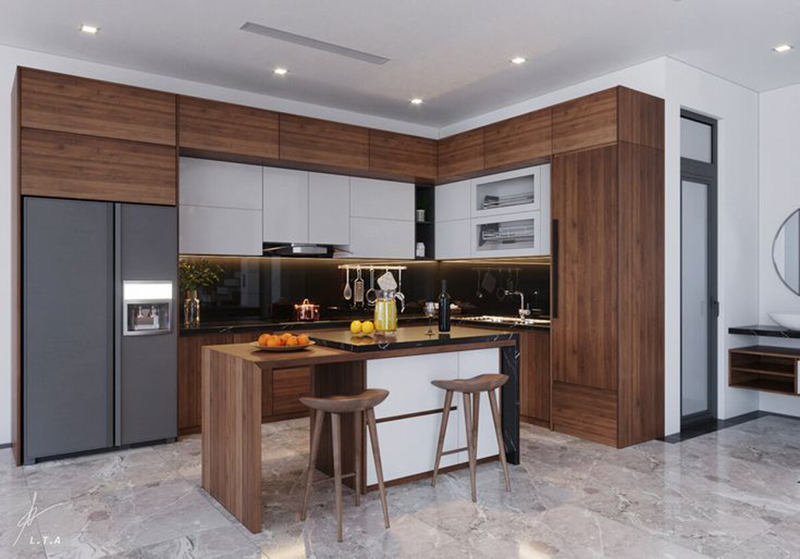 Gia tăng công năng sơ chế – lưu trữ – tiếp khách, mang hơi hướng bếp châu Âu hiện đại.