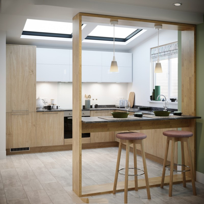 Tủ bếp gỗ veneer được xếp vào nhóm tủ bếp gỗ công nghiệp vì phần cốt bên trong vẫn được sản xuất từ gỗ công nghiệp nhưng lớp bề mặt bên ngoài được phủ một lớp veneer được lạng mỏng từ gỗ tự nhiên. Đó có thể là gỗ xoan đào, gỗ sồi, gỗ óc chó… Nhờ vậy, sản phẩm có vẻ đẹp tự nhiên, tinh tế như gỗ thật mà vẫn có độ bền và giá thành phải chăng.